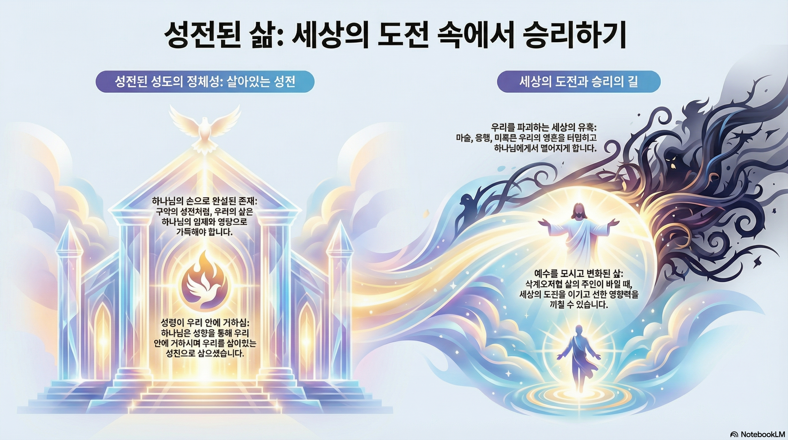 오늘 우리는 성전으로서의 성도와 세상의 도전이라는 주제 아래 네 본문을 통해 우리가 어떻게 '하나님의 성전'으로서 이 땅을 살아가야 하는지를 묵상했습니다. 우리는 하나님의 은혜로 말미암아 성전으로서의 성도가 되었습니다. 역대하 말씀처럼 성전의 완성을 이루시는 하나님의 손길을 신뢰하고, 요한일서 말씀처럼 성령을 우리에게 주심 우리 안에 거하심으로 나타난 하나님의 임재에 감사하십시오. 나훔의 경고처럼 마술, 음행, 미혹과 같은 세상의 도전들을 분별하고 단호히 물리치며, 누가복음 말씀처럼 예수를 모시고 변화된 삶을 살아감으로써 세상의 도전을 이겨내고 하나님의 영광을 드러내십시오. 이처럼 성전으로서의 성도로서 세상의 도전을 이겨내고 하나님께 영광 돌리는 저와 여러분이 되시기를 주님의 이름으로 축원합니다. 아멘.