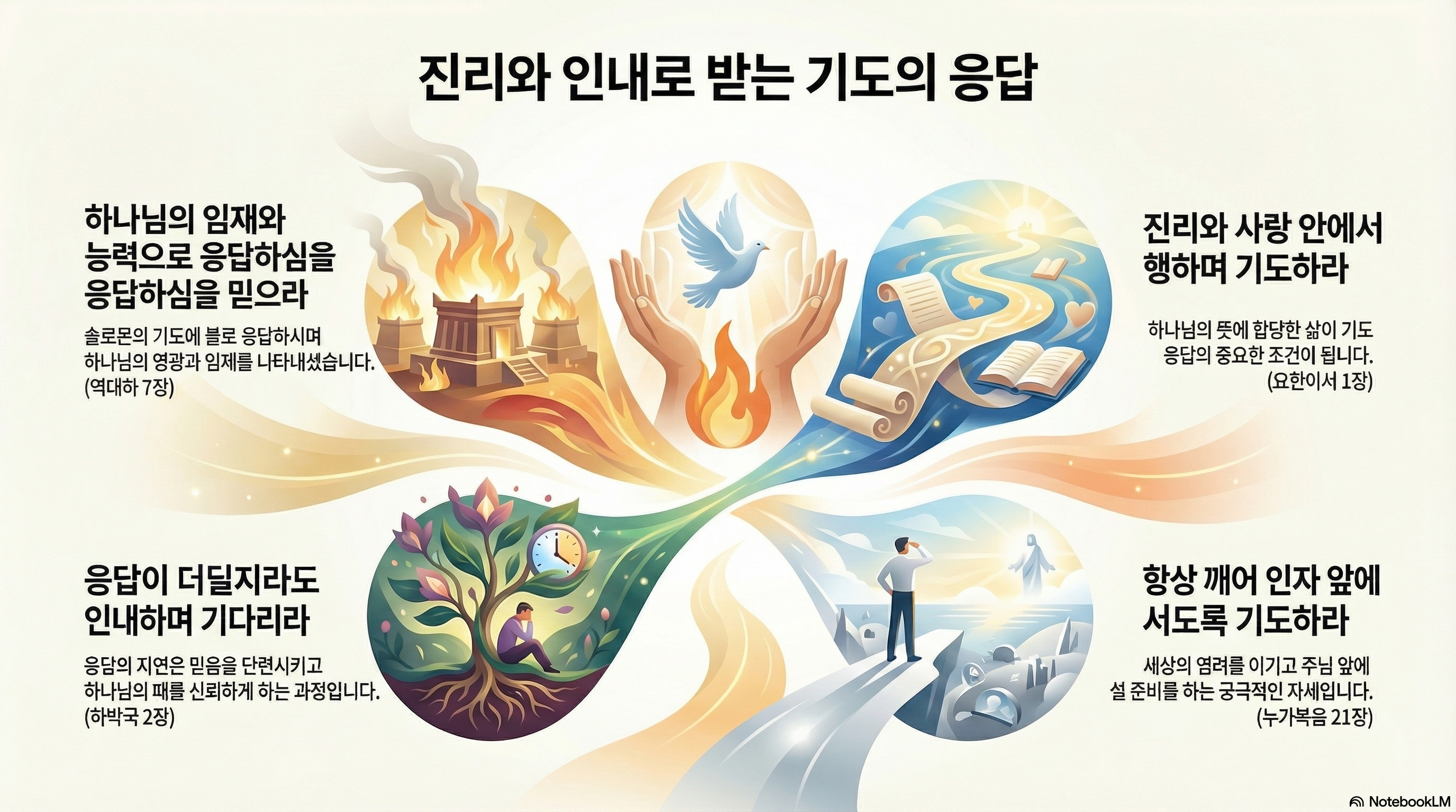 오늘 우리는 기도의 응답이라는 우리의 신앙생활에 가장 필수적이고 실제적인 주제를 가지고 하나님의 말씀을 깊이 상고하고자 합니다. 기도는 우리가 하나님과 소통하며 그분의 뜻을 구하는 특권이자, 우리의 삶을 변화시키는 강력한 통로입니다. 그런데 우리가 드린 기도가 과연 어떻게 응답되며, 그 응답을 위해 우리가 어떤 자세를 취해야 할까요? 오늘 주신 네 본문, 역대하 7장, 요한이서 1장, 하박국 2장, 그리고 누가복음 21장은 기도의 응답이 어떤 모습으로 나타나고, 그 응답을 위해 우리가 어떻게 진정으로 하나님께 나아가야 하는지를 명확히 보여줍니다.