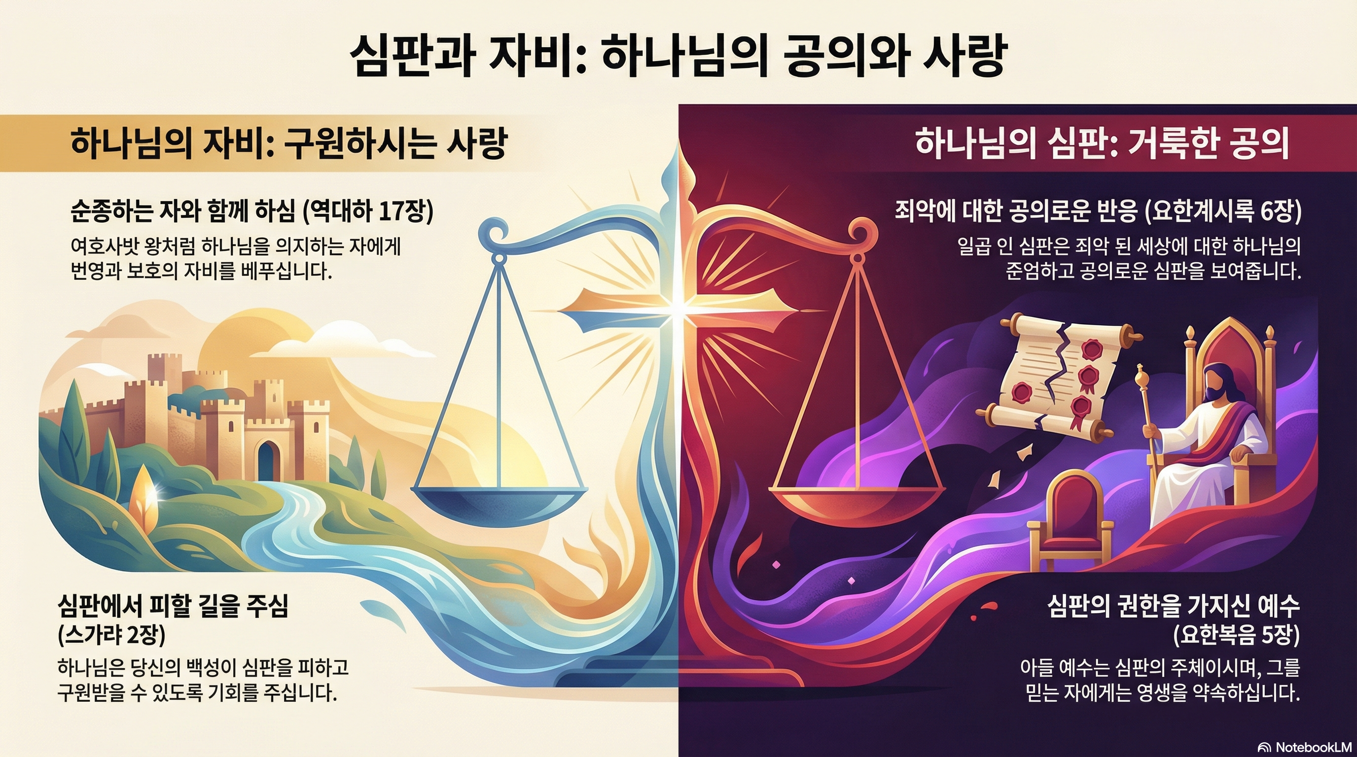 오늘 우리는 심판과 자비라는 엄중하면서도 동시에 은혜로운 주제를 가지고 하나님의 말씀을 깊이 상고하고자 합니다. 심판은 죄에 대한 하나님의 공의로운 반응이며, 인간의 모든 불의를 간과하지 않으시는 그분의 거룩한 성품을 드러냅니다. 그러나 우리 하나님은 심판하시는 분이심과 동시에, 당신의 한없는 자비로 죄인을 용서하시고 구원하시는 분이십니다. 오늘 본문, 역대하 17장, 요한계시록 6장, 스가랴 2장, 그리고 요한복음 5장은 심판과 자비가 어떻게 하나님의 주권적인 역사 속에서 나타나고, 우리가 그분의 공의와 사랑 앞에서 어떻게 반응해야 하는지를 명확히 보여줍니다.