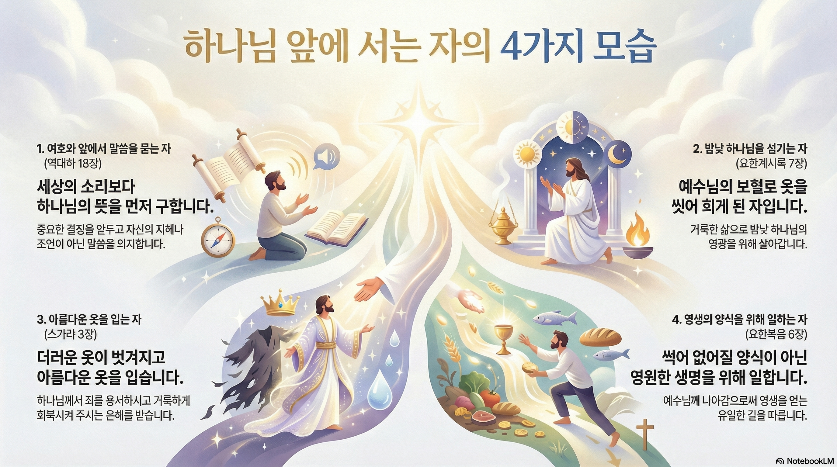 오늘 우리는 하나님 앞에 서는 자라는 주제 아래 네 본문을 통해 우리의 삶이 어떻게 하나님 앞에 합당하게 살아가고, 그분께 영광 돌릴 수 있는지를 묵상했습니다. 우리의 삶은 하나님 앞에 서는 자로서 그분의 거룩하심을 인정하고 그분의 뜻에 순종하는 삶입니다. 여호사밧처럼 여호와 앞에서 말씀을 묻는 겸손함을 가지고, 요한계시록의 성도들처럼 옷을 씻어 희게 함을 입고 밤낮 하나님을 섬기십시오. 스가랴의 환상처럼 아름다운 옷을 입혀주심의 은혜에 감사하고, 예수님의 가르침처럼 영생하도록 있는 양식을 위하여 일하며, 예수께로 오십시오. 이처럼 하나님 앞에 서는 자로서 그분께 영광 돌리고 영원한 생명을 누리는 저와 여러분이 되시기를 주님의 이름으로 축원합니다. 아멘.