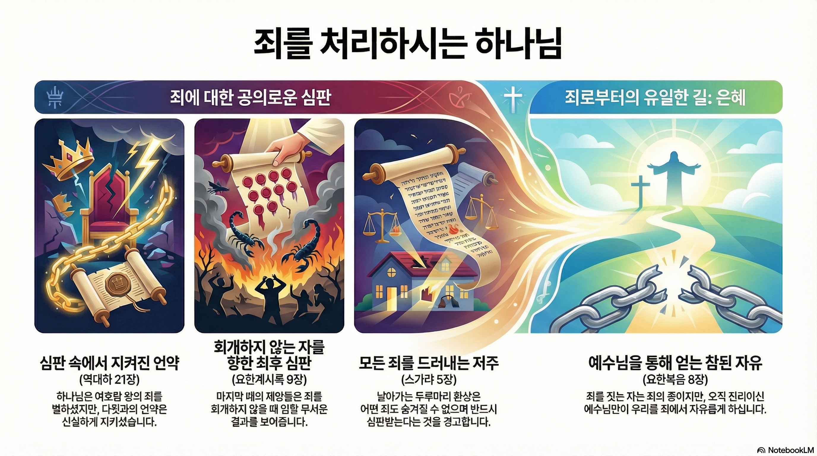 오늘 우리는 죄를 처리하시는 하나님이라는 주제 아래 네 본문을 통해 하나님의 공의로운 심판과 한없는 사랑이 우리의 삶에 어떻게 나타나는지를 묵상했습니다.