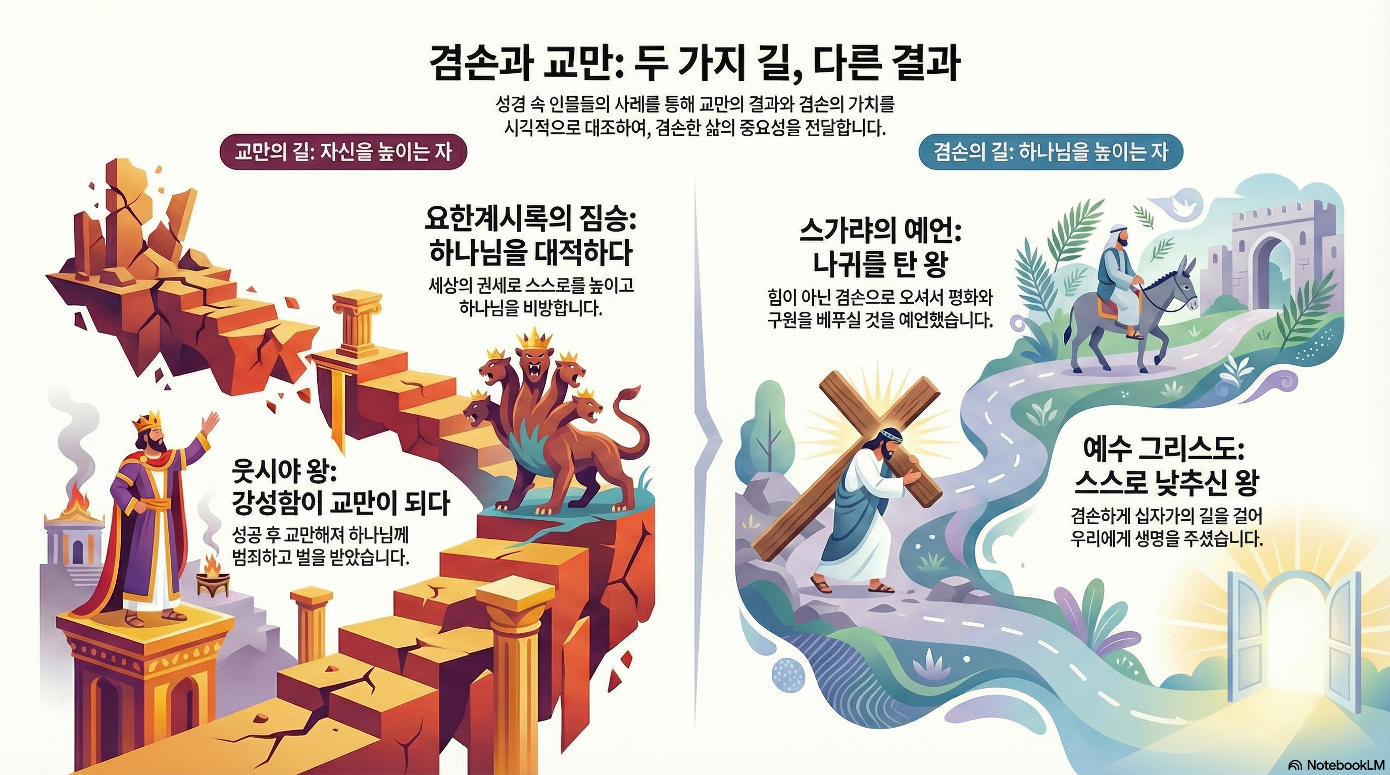오늘 우리는 겸손과 교만이라는 우리 삶과 신앙의 본질을 결정하는 중요한 주제를 가지고 하나님의 말씀을 깊이 상고하고자 합니다. 겸손은 자신을 낮추고 하나님을 높이는 태도이며, 교만은 자신을 과대평가하고 하나님을 대적하는 태도입니다. 이 두 가지 상반된 태도는 우리의 삶에 극명한 결과를 가져옵니다. 오늘 본문, 역대하 26장, 요한계시록 13장, 스가랴 9장, 그리고 요한복음 12장은 겸손과 교만이 어떻게 우리의 삶과 역사에 나타나고, 우리가 어떤 길을 선택해야 하는지를 명확히 보여줍니다.