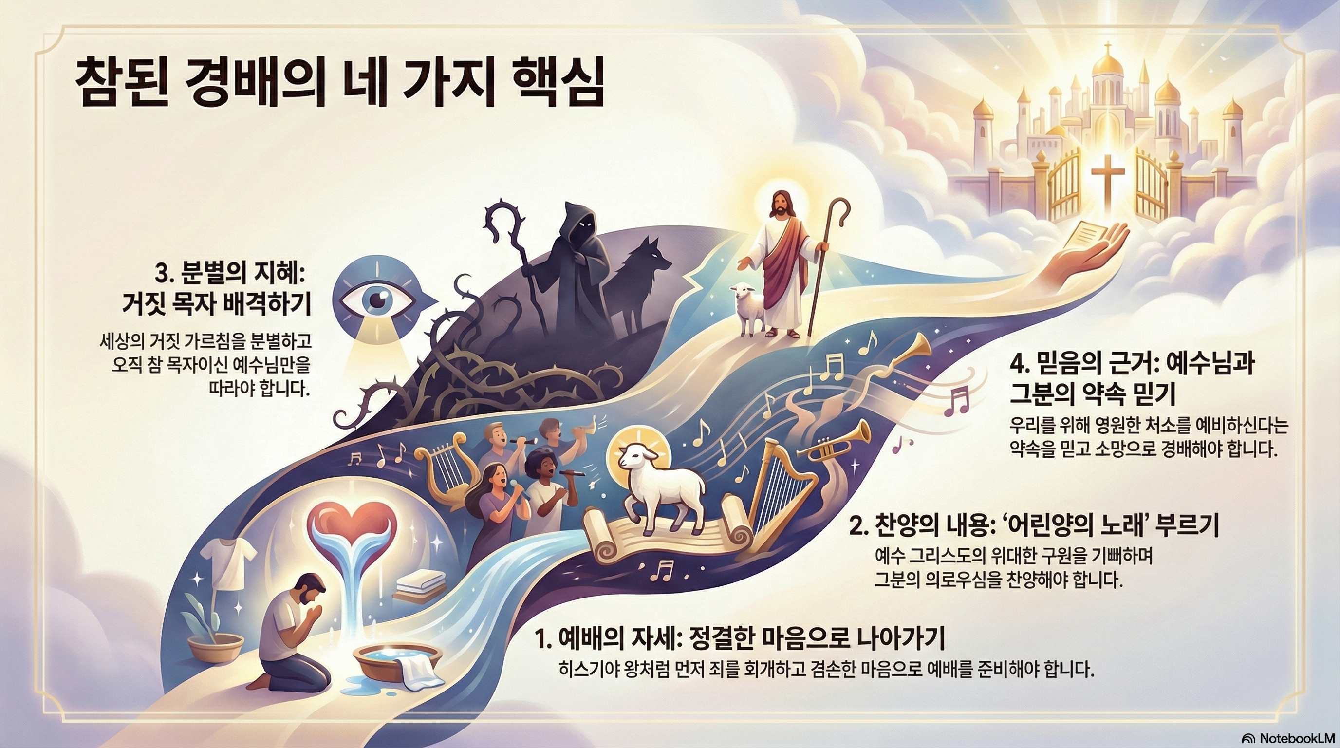 세상에는 하나님을 거짓으로 섬기도록 유도하는 거짓 목자들이 존재합니다. 그러나 우리는 그들의 미혹에 넘어가지 않고, 오직 참 목자이신 예수님만을 우리의 인도자로 삼아야 합니다. 거짓 목자의 배격은 진리를 분별하고 하나님의 말씀에 순종하는 경배의 자세입니다. 참 목자이신 예수님에 대한 소망을 가질 때, 우리는 주님께 온전한 경배를 드릴 수 있습니다.