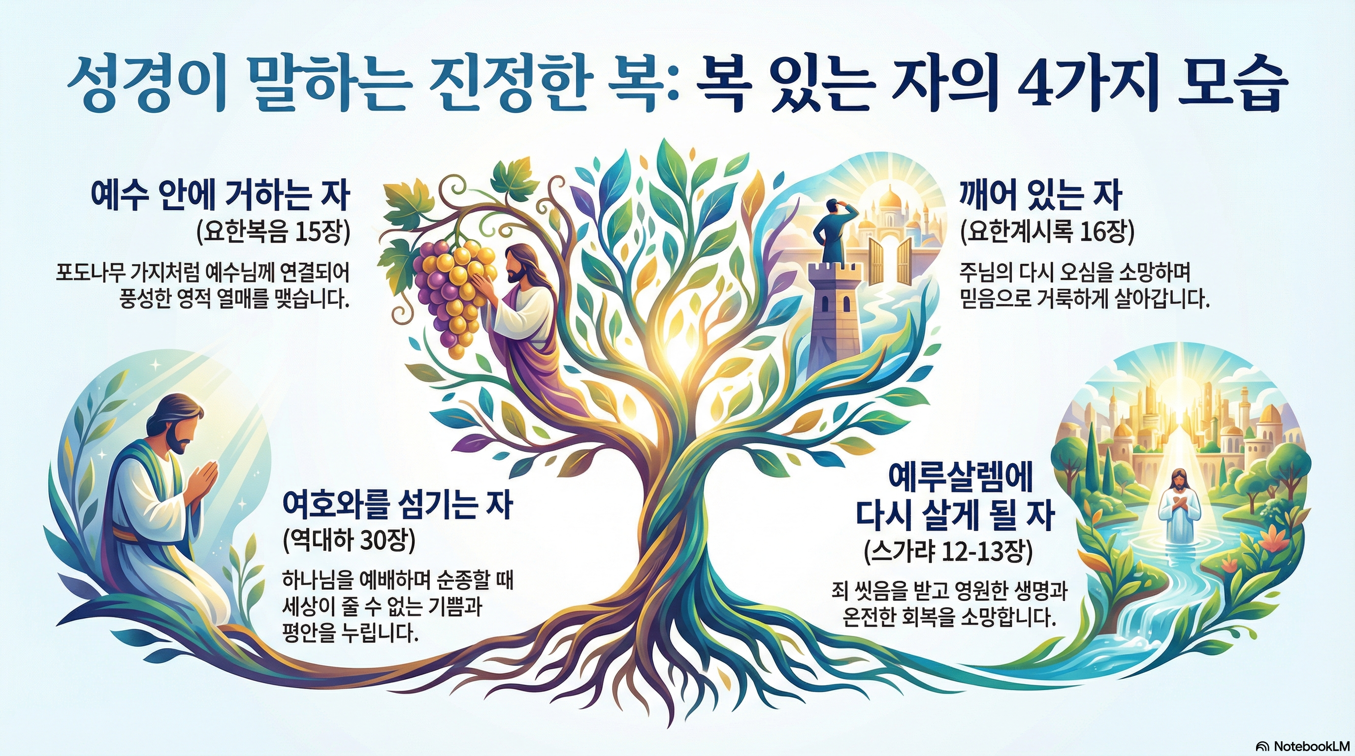 요한복음 15장은 예수님께서 자신을 참 포도나무요 제자들을 가지에 비유하시며, 제자들이 예수 안에 거해야 할 것을 강조하는 내용을 기록합니다. 가지가 포도나무에 붙어 있지 않으면 스스로 열매를 맺을 수 없듯이, 제자들도 예수님 안에 거하지 않으면 아무것도 할 수 없습니다. 그러나 예수 안에 거하는 자는 풍성한 열매를 맺을 것이라고 약속하십니다. "내 안에 거하라 나도 너희 안에 거하리라 가지가 포도나무에 붙어 있지 아니하면 스스로 열매를 맺을 수 없음 같이 너희도 내 안에 있지 아니하면 그러하리라"(요 15:4). 예수 안에 거하는 자는 복 있는 자의 가장 핵심적인 특징이자, 모든 복의 근원입니다.