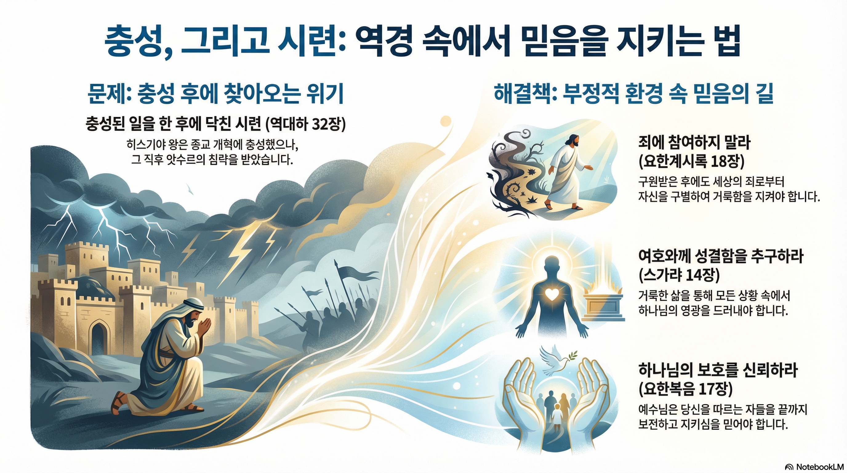 오늘 우리는 충성과 그 후에 오는 부정적 환경이라는 다소 역설적이면서도 실제적인 주제를 가지고 하나님의 말씀을 깊이 상고하고자 합니다. 우리는 하나님께 충성하면 모든 것이 순탄할 것이라고 기대하지만, 때로는 충성된 삶을 산 후에 예상치 못한 부정적 환경에 직면하기도 합니다. 그렇다면 이러한 부정적 환경 속에서 우리는 어떻게 우리의 충성을 지켜나갈 수 있을까요? 오늘 본문, 역대하 32장, 요한계시록 18장, 스가랴 14장, 그리고 요한복음 17장은 충성과 그 후에 오는 부정적 환경 속에서 우리가 어떤 믿음과 소망을 가져야 하는지를 명확히 보여줍니다.