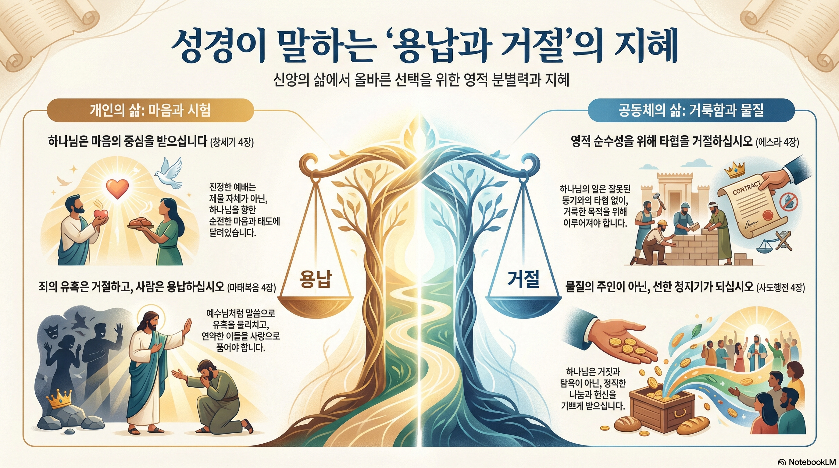 하나님은 그들의 물질을 거절하신 것이 아니라, 그들 안에 스며든 '위선'을 거절하셨습니다. 물질은 우리의 삶을 지탱하는 수단이지만, 결코 주인이 될 수는 없습니다. 내가 쥔 것을 가난한 이웃과 나누는 '너그러운 용납'과, 물질이 우상이 되지 않도록 경계하는 '엄격한 거절'. 이 두 갈래의 마음이 만날 때 비로소 우리는 참된 하늘의 부유함을 누리게 됩니다.