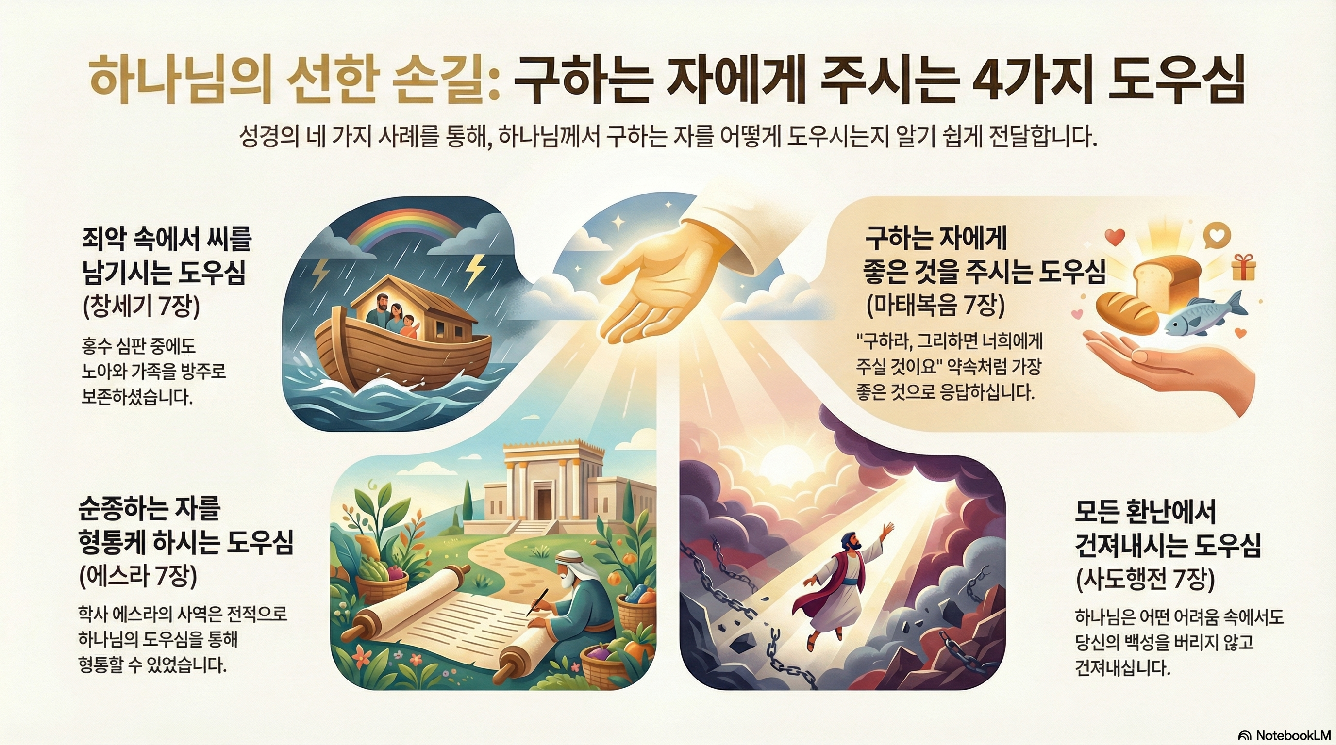 세상이 온통 잿빛으로 변해버린 것 같아도, 하나님은 반드시 남겨진 씨앗을 보호하십니다. 하나님의 도우심은 모두가 끝이라고 말할 때 시작되는 새로운 시작의 약속입니다. 혹시 지금 당신의 삶에 거센 비바람이 몰아치고 있나요? 기억하십시오. 하나님은 당신을 보존하시기 위해 당신만의 방주를 준비하고 계시며, 그분의 선한 손이 당신이라는 희망의 씨앗을 꼭 붙들고 계십니다.