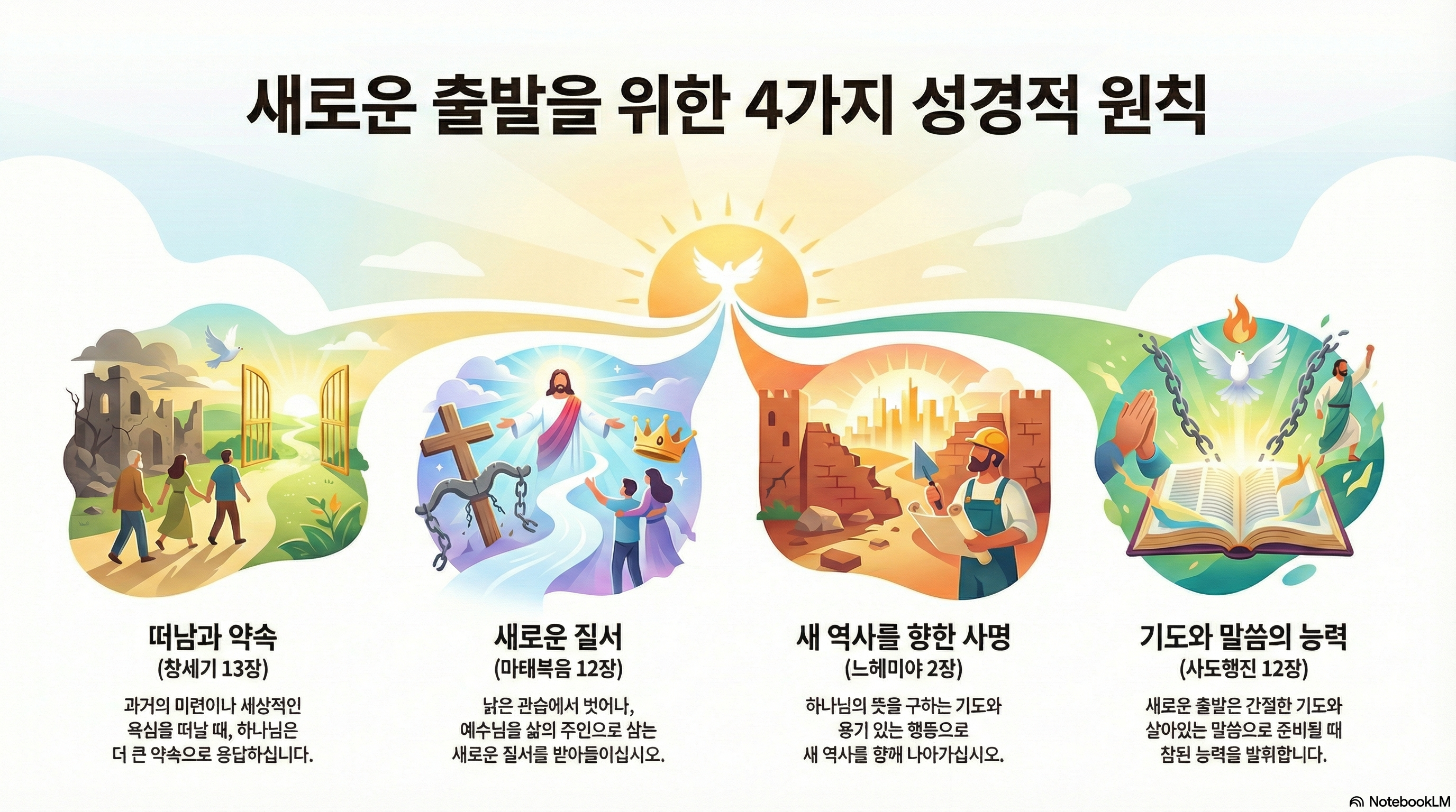 새로운 출발이 중도에 꺾이지 않고 역사가 되기 위해서는 기도와 말씀이라는 두 기둥이 튼튼해야 합니다. 기도는 하늘의 능력을 이 땅으로 끌어오는 통로가 되고, 말씀은 우리 걸음의 방향을 알려주는 빛이 됩니다. 환난 속에서도 기도를 멈추지 않고 말씀을 붙잡는 영혼만이, 하나님이 행하시는 기적 같은 새 역사의 주인공이 될 수 있습니다.