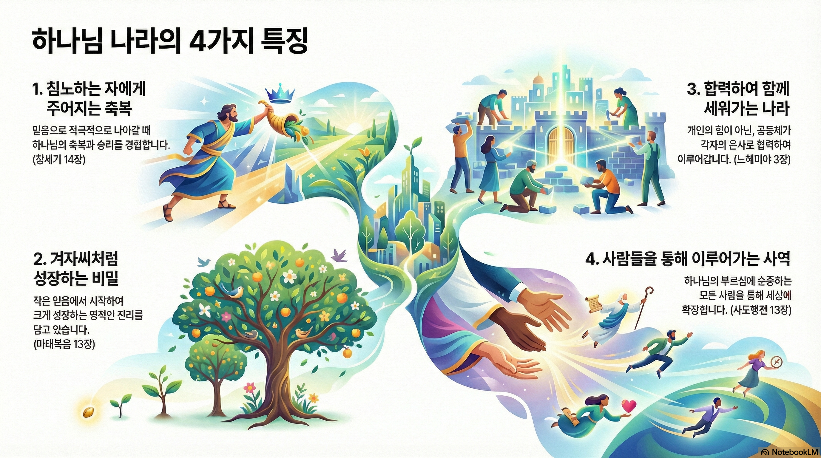 이것이 하나님 나라의 비밀입니다. 겉보기에는 보잘것없어 보이는 우리의 작은 순종과 한마디의 복음이 세상을 변화시키는 거대한 동력이 됩니다. 세상의 지혜로는 결코 이해할 수 없는 이 신비는, 오직 겸손하게 말씀을 묵상하고 성령의 조명을 구하는 영혼들에게만 그 찬란한 빛을 드러냅니다. 당신의 오늘이라는 작은 밭에 심긴 그 씨앗을 과소평가하지 마십시오.