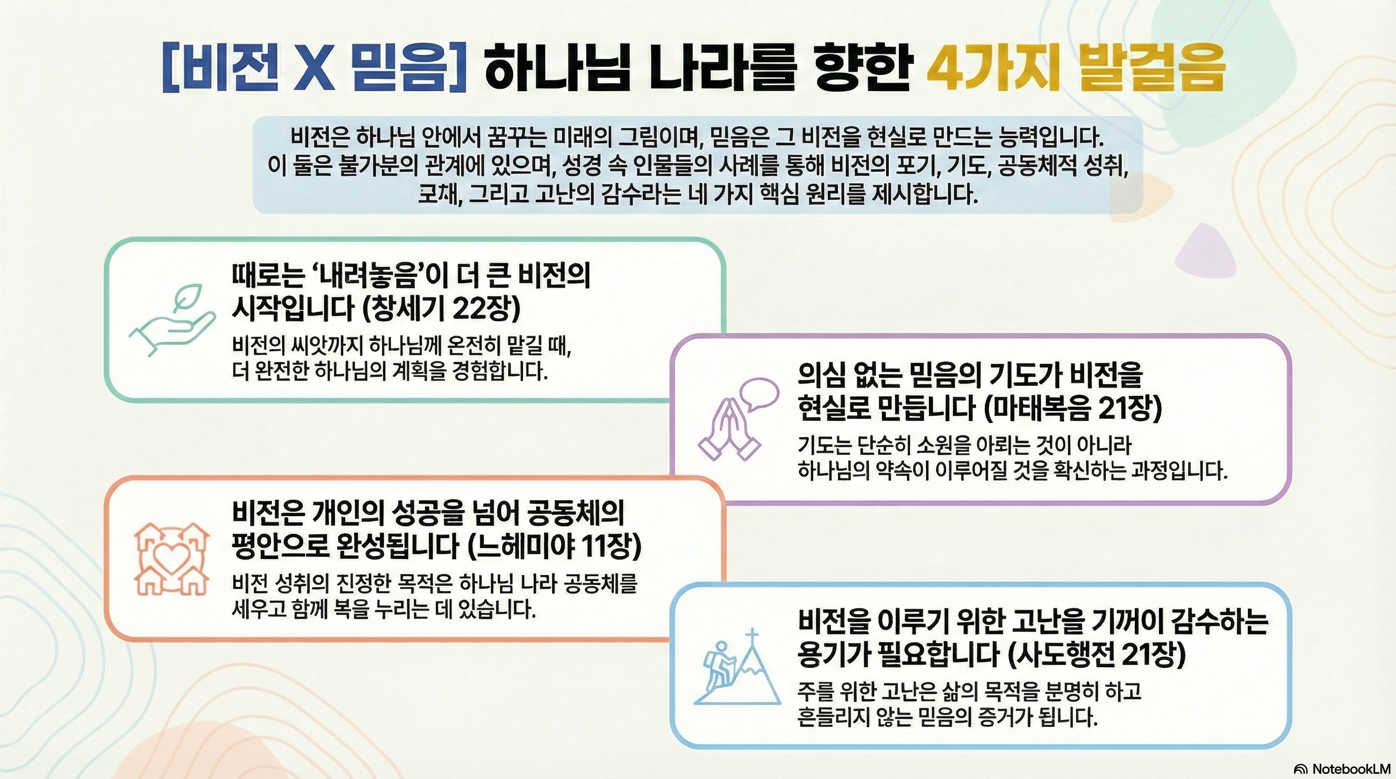 우리가 비전에 사로잡히면 때로 비전 그 자체가 우상이 되곤 합니다. 하지만 참된 믿음은 내가 붙들고 있는 비전을 하나님의 손에 다시 올려드리는 용기입니다. 아브라함이 비전을 포기하려 했을 때, 하나님은 '여호와 이레'의 예비하심을 통해 더 크고 영원한 별과 같은 비전을 그에게 확증해 주셨습니다.