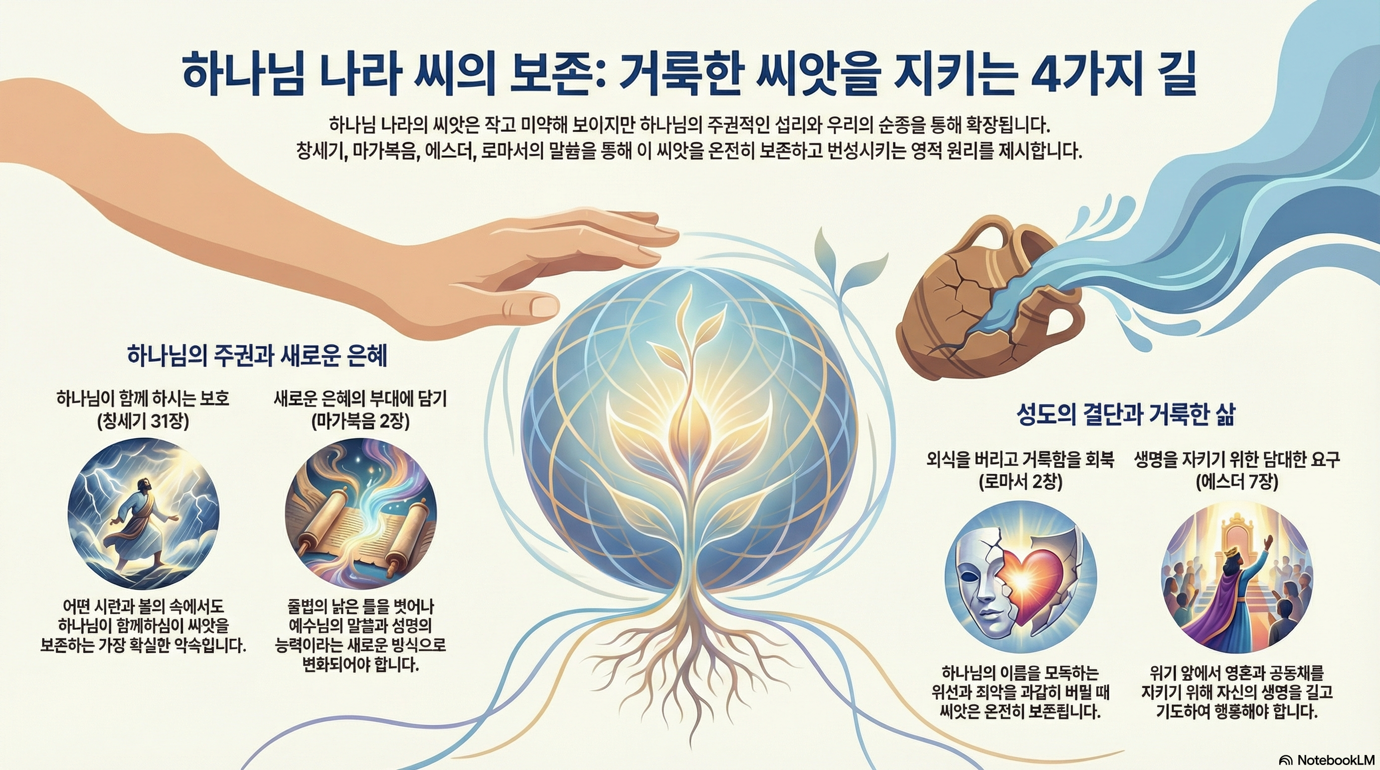 씨가 보존된다는 것은 단순히 과거의 형식을 고수하는 것이 아니라, 예수 그리스도의 은혜라는 '새 부대' 안에서 날마다 새로워지는 것을 의미합니다. 복음의 본질을 지키기 위해 우리는 위선과 형식주의를 벗어던지고, 성령의 인도하심을 따르는 유연하고 역동적인 믿음을 소유해야 합니다. 그것이 바로 생명의 씨앗을 생생하게 보존하는 길입니다.