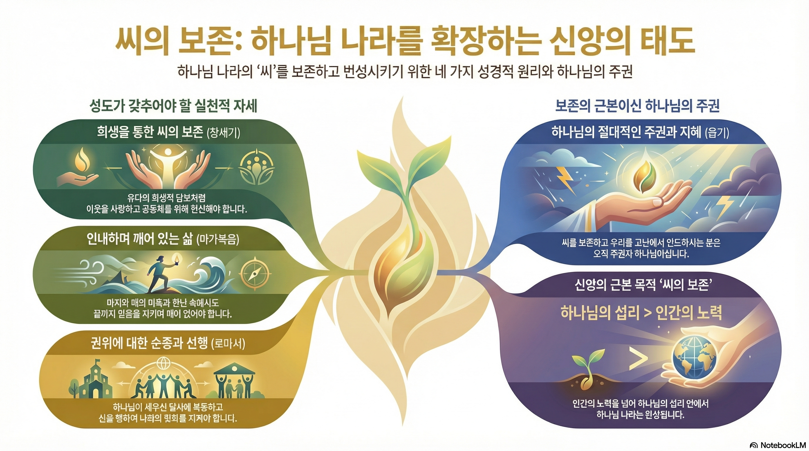 씨를 보존하시는 궁극적인 주체는 인간이 아니라 하나님이십니다. 우리가 어떤 위협 속에 있을지라도, 하나님의 주권적인 지혜와 능력이 우리를 붙들고 계심을 믿는 것이 가장 안전한 보존의 길입니다. 나의 연약함을 인정하고 주권자 하나님께 나의 생명을 전적으로 의탁하십시오.