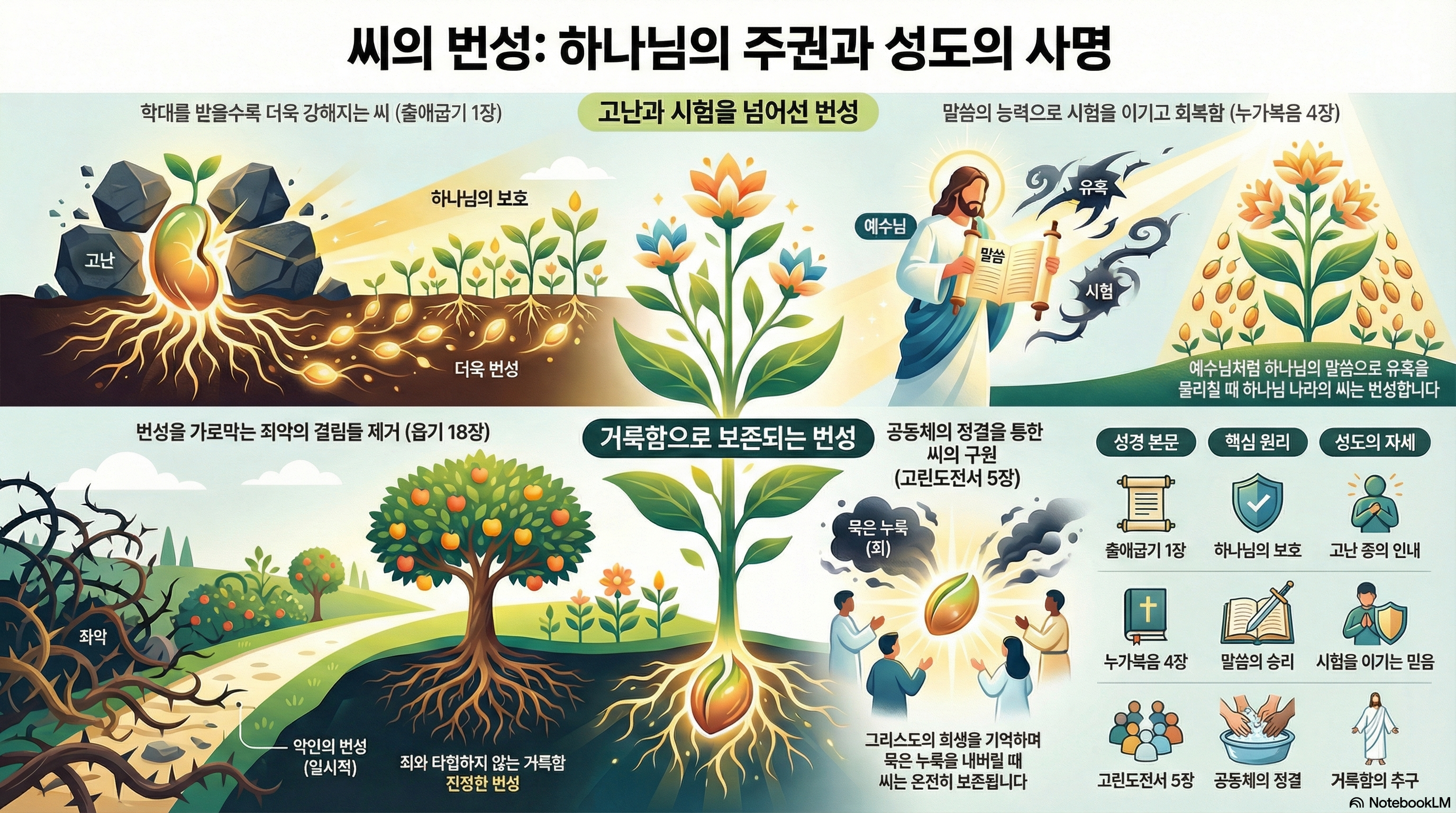 씨앗이 썩지 않고 번성하기 위해서는 정결함이 필수입니다. 죄와 타협하는 번성은 결국 공멸로 이어집니다. 우리 삶에서 묵은 누룩을 내버리고 거룩함을 지키는 것이, 하나님 나라의 씨앗이 건강하게 자라나 온 세상을 덮는 숲이 되게 하는 비결입니다.