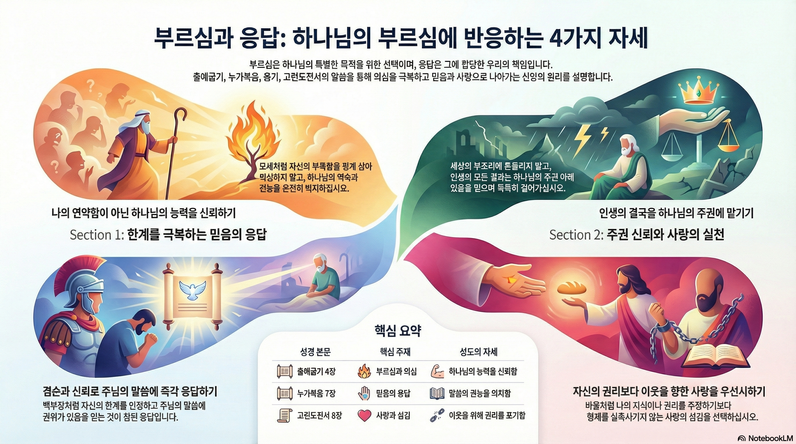 하나님의 부르심에 대한 첫 번째 응답은 나의 부족함을 인정하고 하나님의 채우심을 기대하는 것입니다. 하나님은 우리가 완벽해서 부르시는 것이 아니라, 부르신 후에 우리를 감당케 하십니다. 나의 말주변이 아니라 하나님의 지팡이를 의지할 때 부르심의 길은 열립니다.
