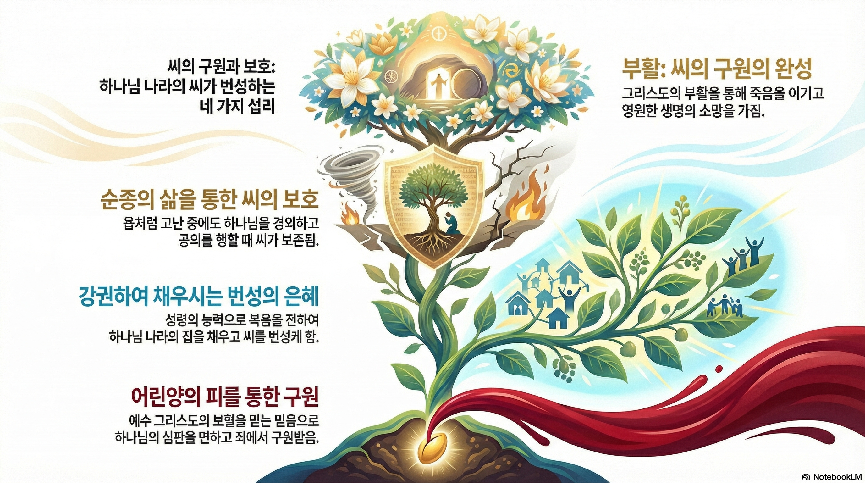 부활은 씨의 구원이 도달할 최종 목적지입니다. 죽음은 우리를 삼키지 못하며, 그리스도의 부활은 우리가 얻을 영원한 승리의 보증이 됩니다. 이 부활의 소망이 있기에 우리는 세상의 어떤 박해와 죽음의 위협 속에서도 흔들리지 않고 하나님 나라의 씨앗으로서 당당히 살아갈 수 있습니다.