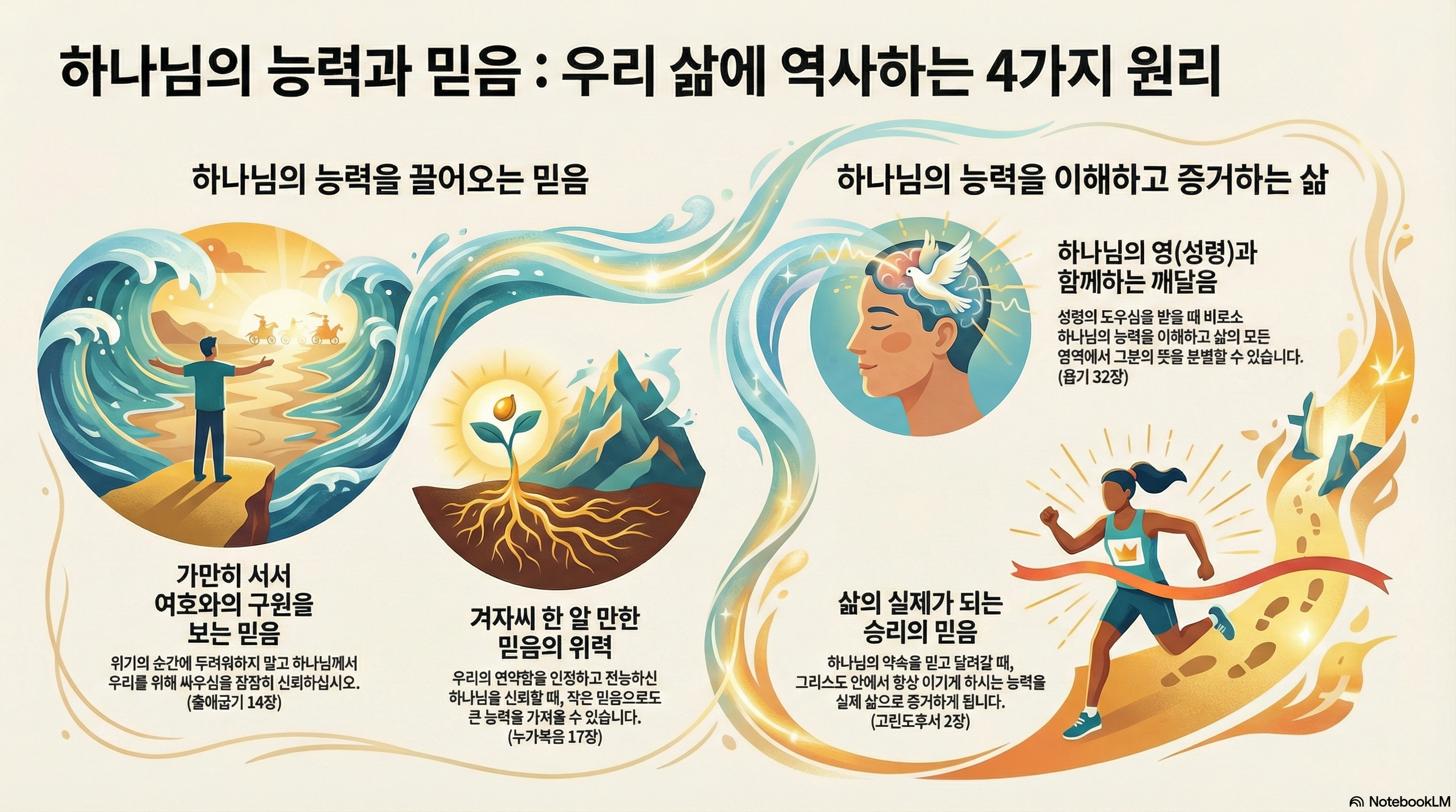 하나님의 능력은 성령의 감동하심을 통해 우리 내면에 임합니다. 우리 지혜의 한계를 인정하고 성령님의 도우심을 믿음으로 구할 때, 전능자의 숨결이 우리를 일깨워 하나님의 능력을 올바르게 이해하고 경험하게 하십니다.