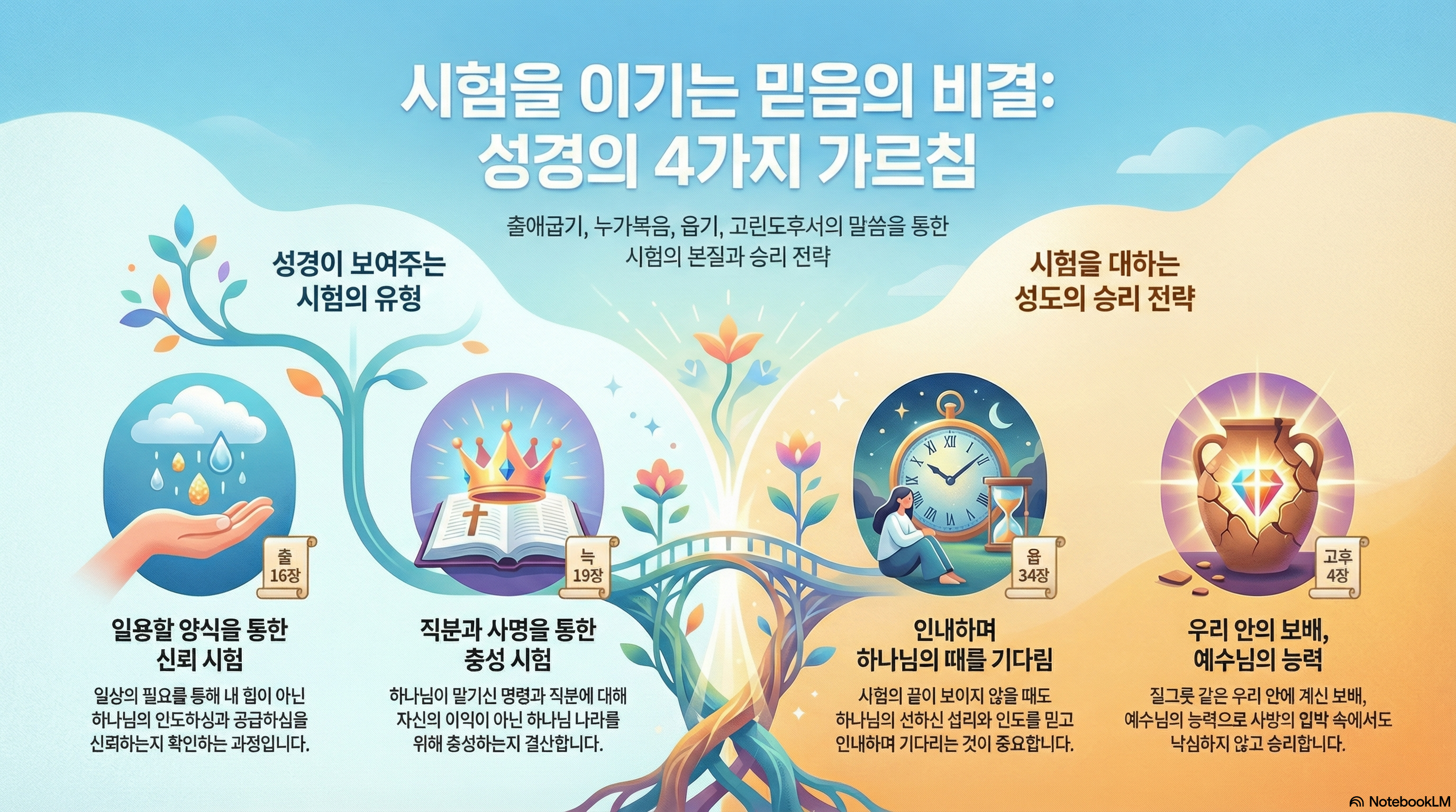 시험을 이기는 비결은 내 능력이 아닌 내 안의 예수님께 있습니다. 질그릇은 깨지기 쉬우나 그 안의 보배는 영원합니다. 시험이 거셀수록 우리는 내가 질그릇임을 절감하게 되고, 역설적으로 그 속에 계신 예수님의 생명이 더욱 선명하게 나타나게 됩니다.
