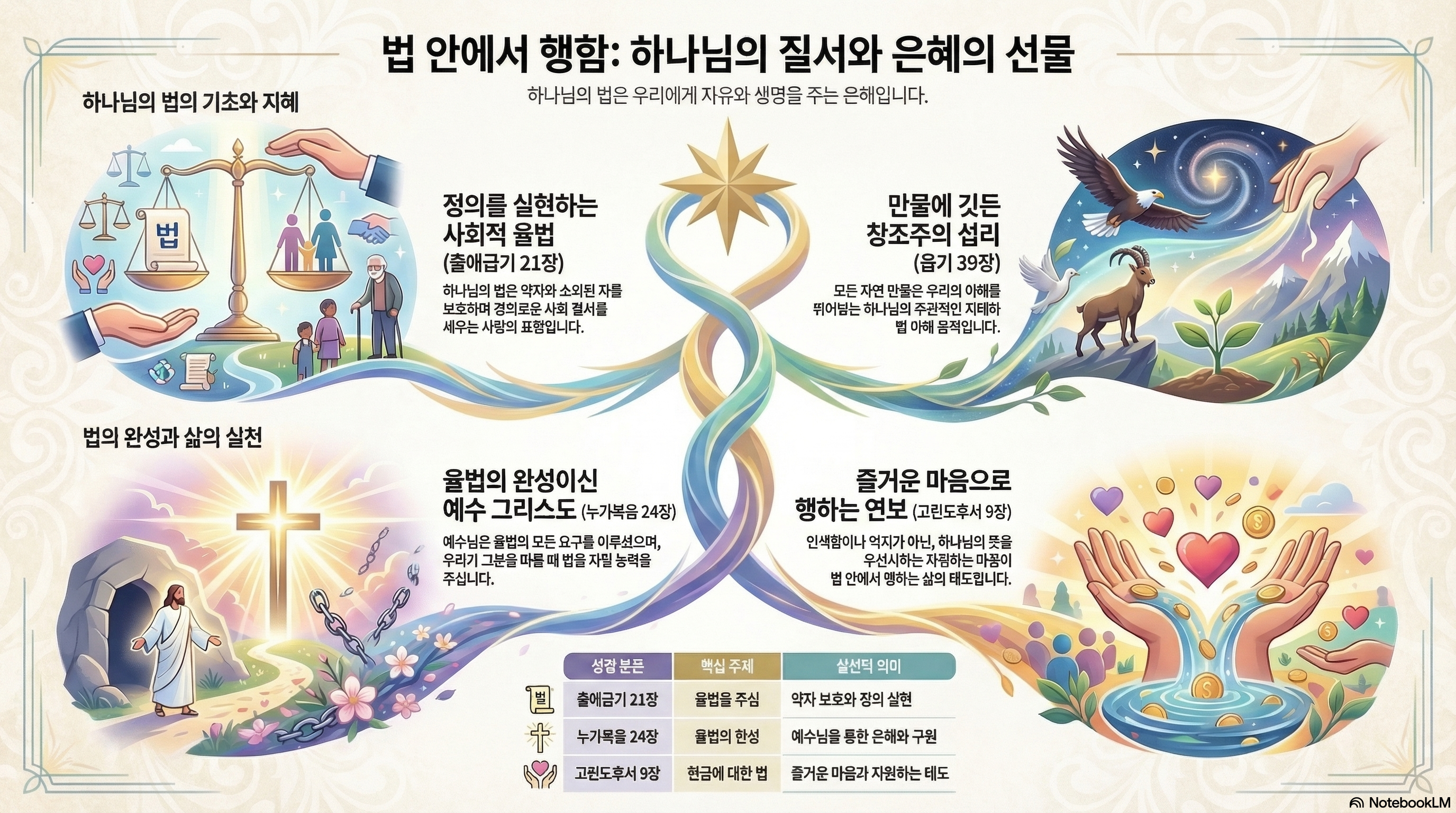 하나님의 법 안에서 행한다는 것은 이웃의 권리를 내 몸처럼 존중하는 것입니다. 법은 단순히 금지 명령이 아니라, 우리가 서로를 어떻게 사랑하고 책임져야 하는지를 가르쳐주는 실천적 가이드라인입니다. 약자를 배려하는 마음이 곧 법의 핵심입니다.