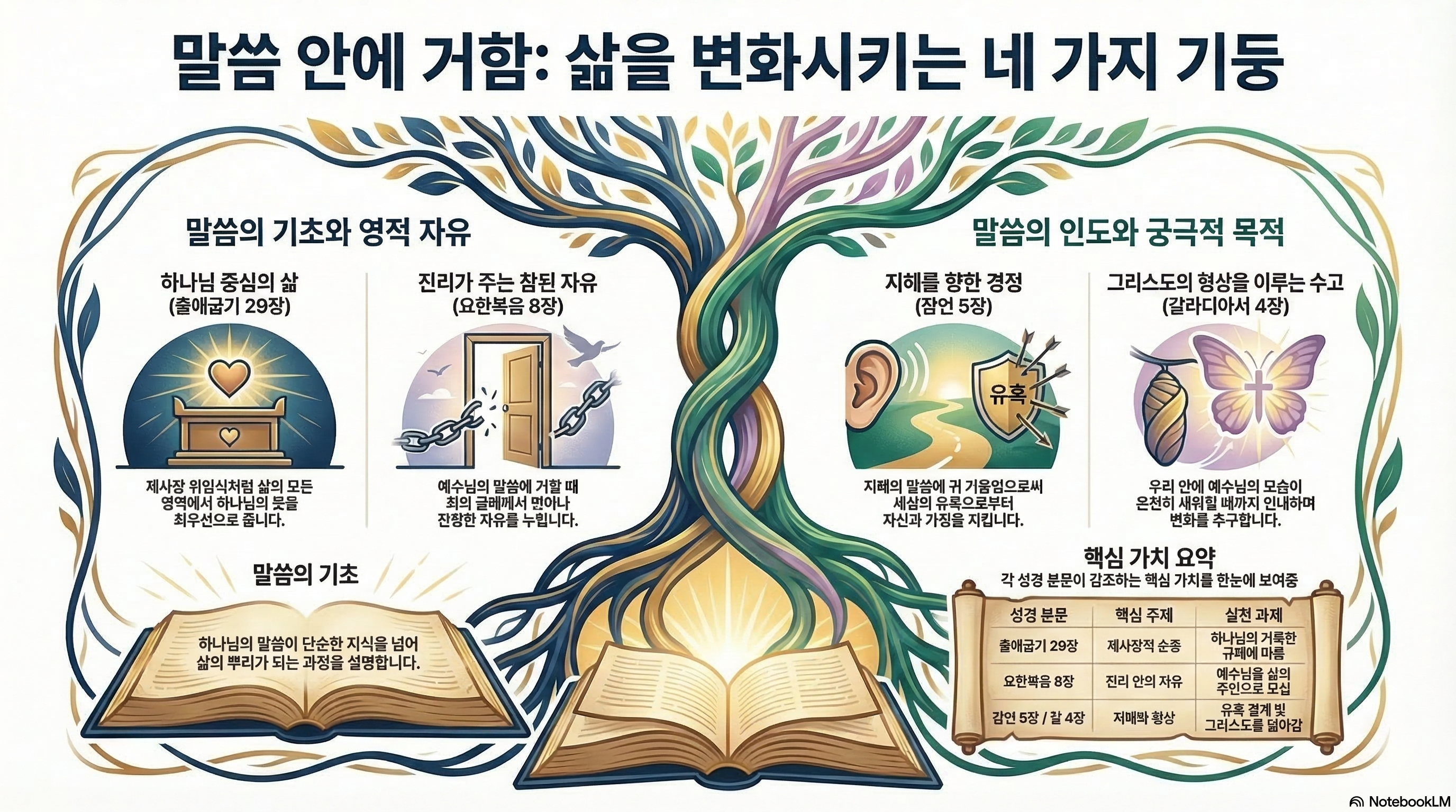 말씀 안에 거함은 하나님이 정하신 거룩한 질서 순복하는 것입니다. 제사장들이 자기 마음대로 제사 지내지 않고 오직 말씀대로 행할 때 하나님이 그들 중에 거하셨듯이, 우리 역시 하나님의 말씀이 지시하는 방식대로 삶의 예배를 드릴 때 거룩한 백성으로 세워집니다.