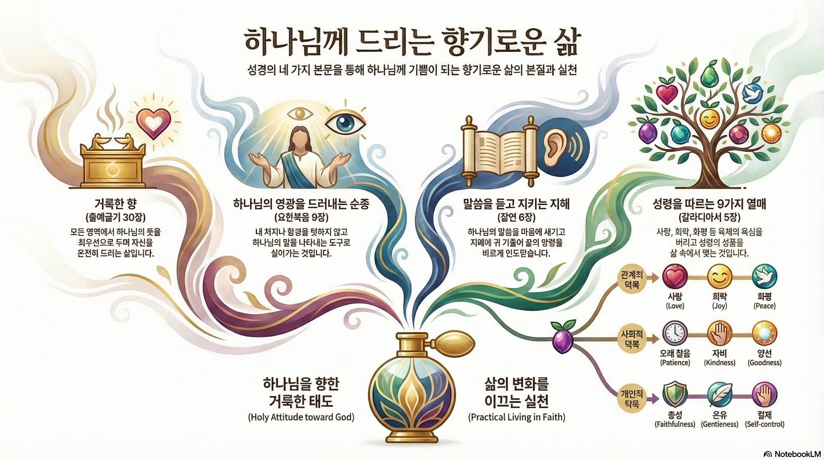 가장 강력한 그리스도의 향기는 바로 성령의 열매입니다. 우리가 억지로 향기를 내려고 애쓰는 것이 아니라, 내 안의 성령님께 순종할 때 주님의 성품이 우리 인격을 통해 자연스럽게 배어 나오게 됩니다. 이것이 세상을 변화시키는 가장 거룩한 향기입니다.