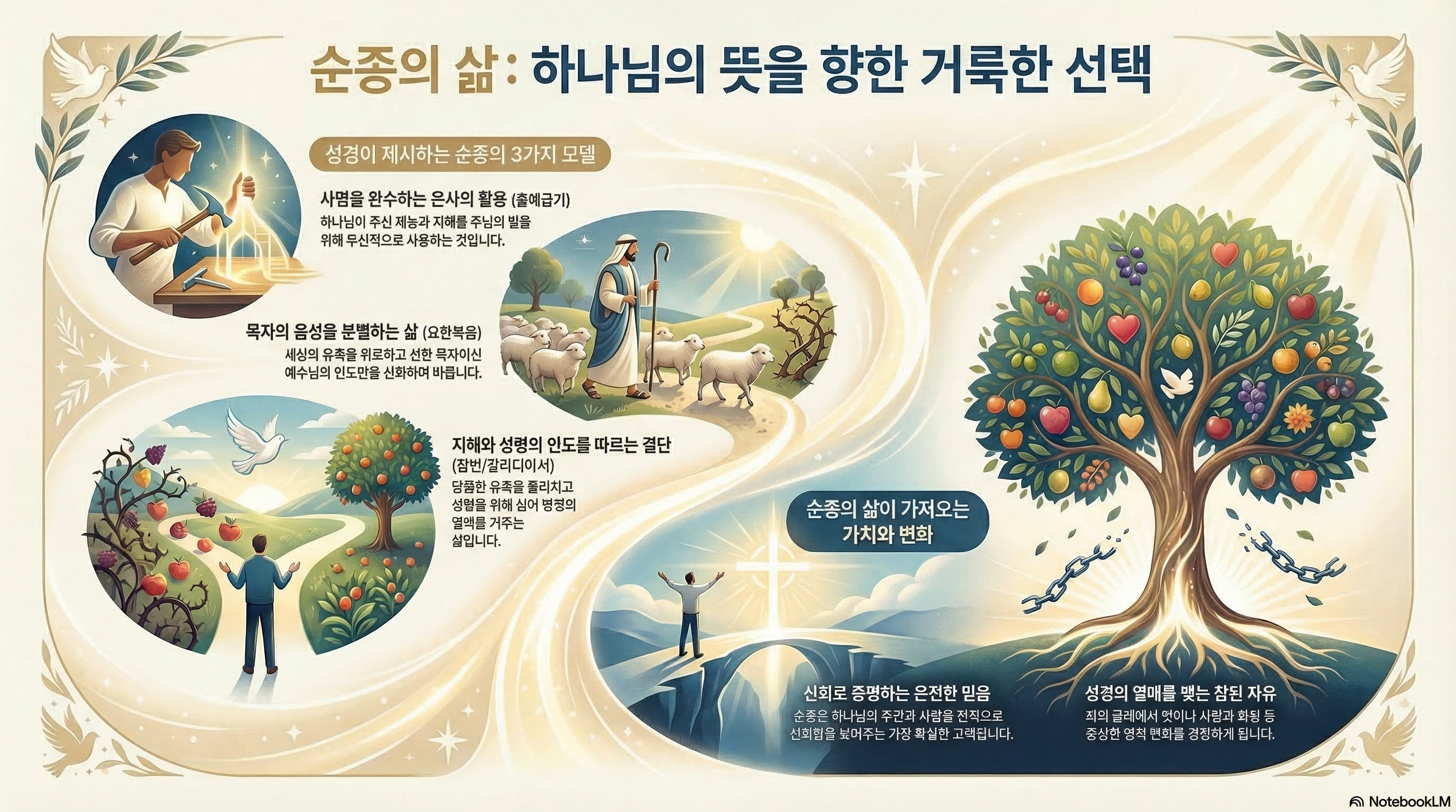 참된 순종은 주님과의 친밀한 사귐에서 나옵니다. 주님의 음성에 귀가 열려 있는 사람은 세상의 유혹적인 목소리에 미혹되지 않습니다. 오늘 하루, 내 생각의 소리를 줄이고 선한 목자 되신 예수님의 세밀한 음성을 듣고 한 걸음을 떼는 것이 가장 안전한 순종의 길입니다.
