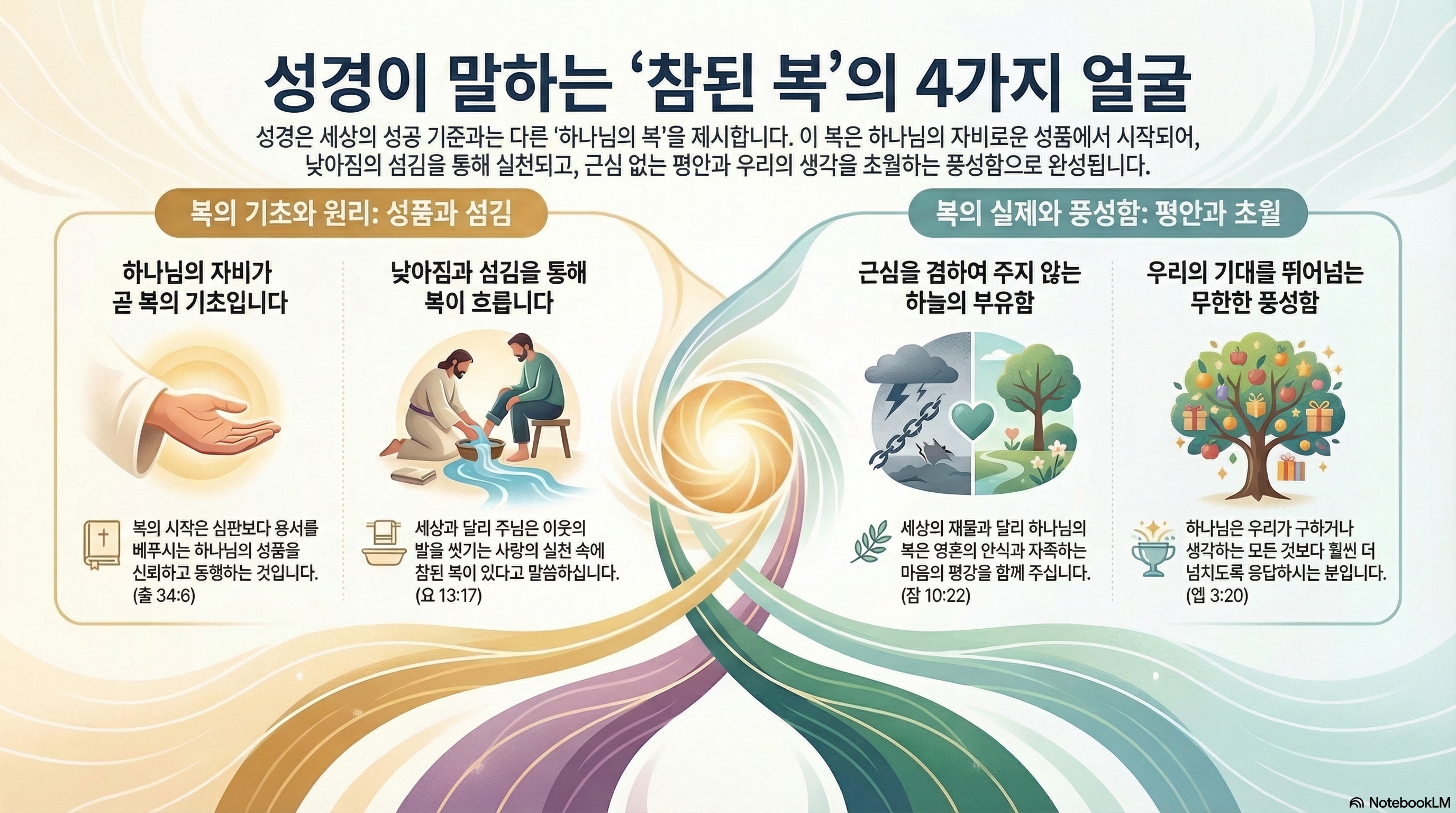 에베소서 3장은 하나님의 무한한 풍성함에 대한 사도 바울의 장엄한 찬양과 기도로 가득합니다. 바울은 하나님을 가리켜 "우리가 구하거나 생각하는 모든 것에 더 넘치도록 능히 하실 이(엡 3:20)"라고 고백합니다. 하나님의 복은 우리의 좁은 지혜와 기대를 훨씬 앞질러 역사합니다.