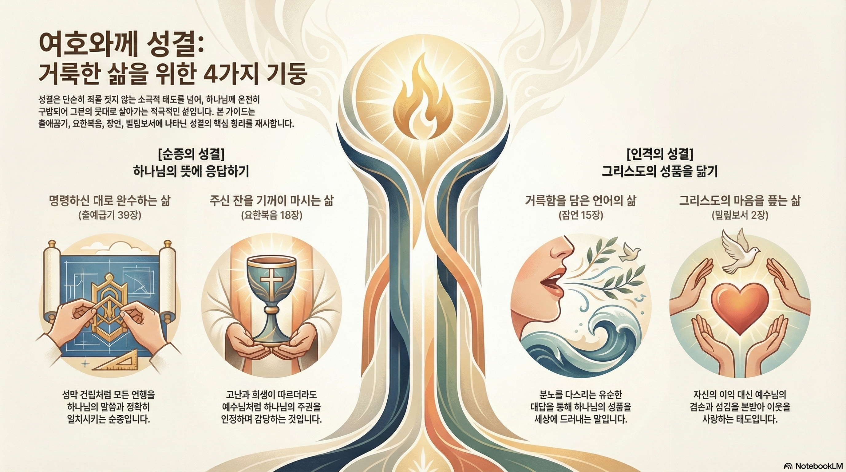 성결의 가장 실제적인 증거는 입술의 파수꾼입니다. 우리 마음속에 하나님의 성결이 머물면, 입술을 통해 흘러나오는 말 또한 생명을 살리고 평화를 만드는 향기가 됩니다. 오늘 나의 말이 누군가의 마음에 상처를 입히는 과격한 말인지, 아니면 하나님의 지혜를 담은 유순한 대답인지 돌아보아야 합니다.