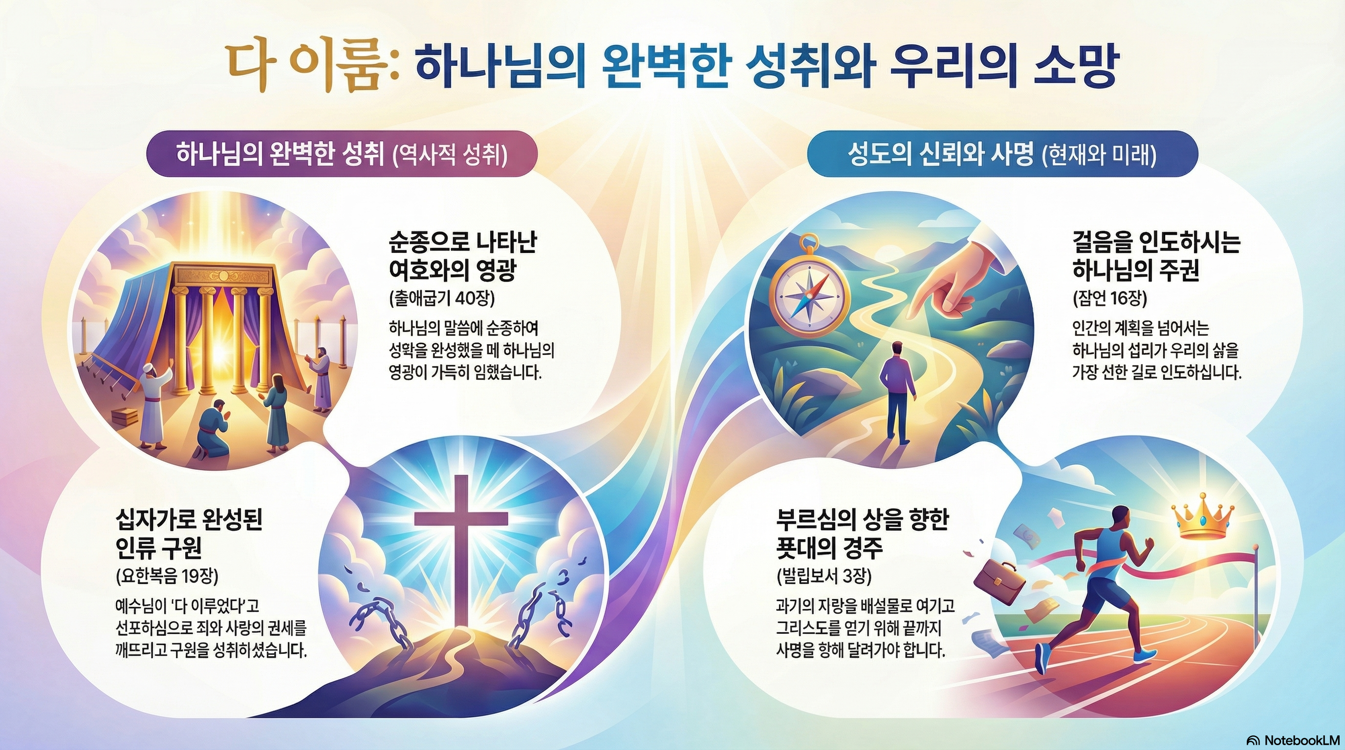 그리스도인의 삶은 완성을 향해 전진하는 삶입니다. 주님이 다 이루신 구원을 기초 삼아, 이제는 하나님이 위에서 부르신 부름의 상을 얻기 위해 멈추지 않고 달리는 것입니다. 과거의 성취에 안주하거나 실패에 매이지 않고, 영광스러운 결승선을 바라보며 매일 한 걸음씩 나아가는 것이 다 이룸을 향한 성도의 태도입니다.