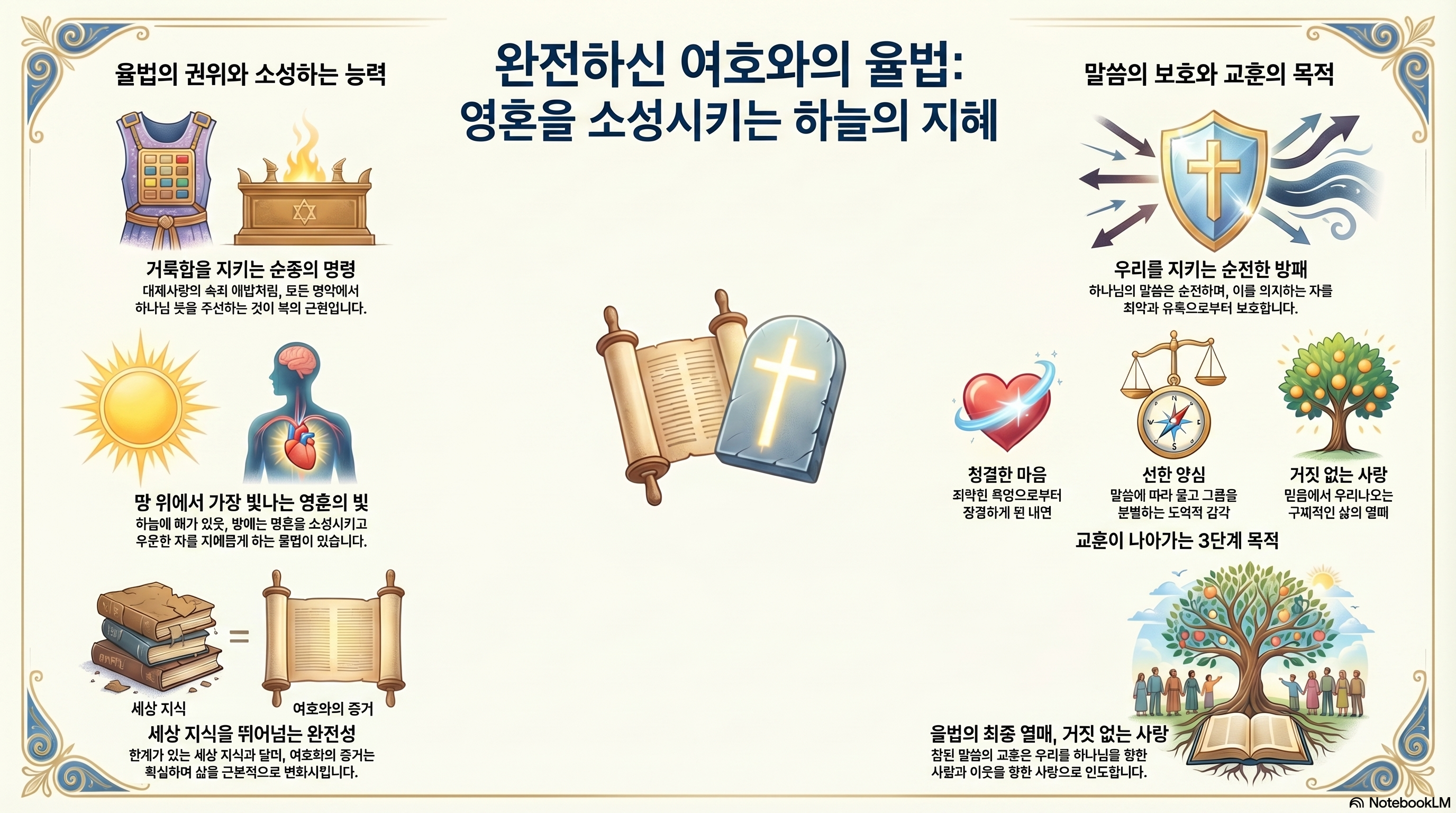 하나님의 율법은 영적인 생명력의 근원입니다. 세상 지식은 머리를 채우지만, 하나님의 말씀은 죽어가는 영혼을 살려내고(소성), 미련한 자를 분별력 있게 만듭니다. 해가 없으면 생명이 살 수 없듯, 율법의 빛이 없는 영혼은 메마를 수밖에 없습니다.