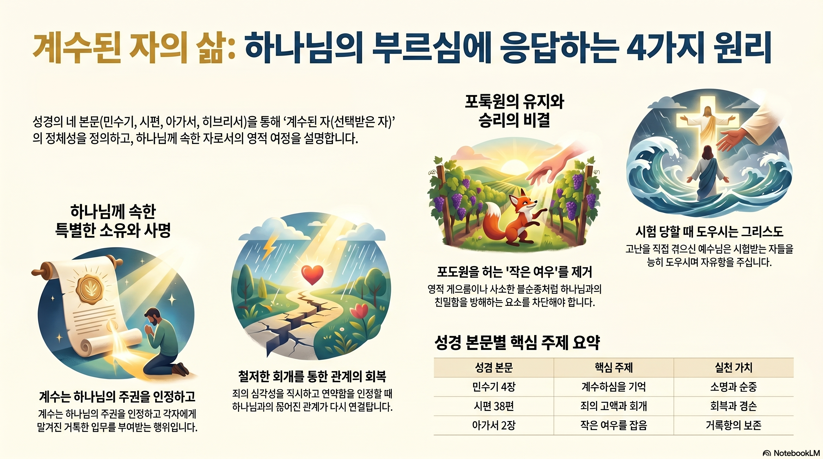 계수된 자의 삶은 영적인 경계심을 늦추지 않는 것입니다. 큰 죄보다 무서운 것은 '작은 여우'와 같은 사소한 습관, 작은 불평, 영적인 게으름입니다. 이것들이 하나님과 나 사이의 친밀함을 갉아먹습니다. 꽃피는 은혜의 계절일수록, 주님과의 사랑을 방해하는 미세한 죄의 요소들을 단호하게 잡아내어 관계의 순수성을 지켜내야 합니다.