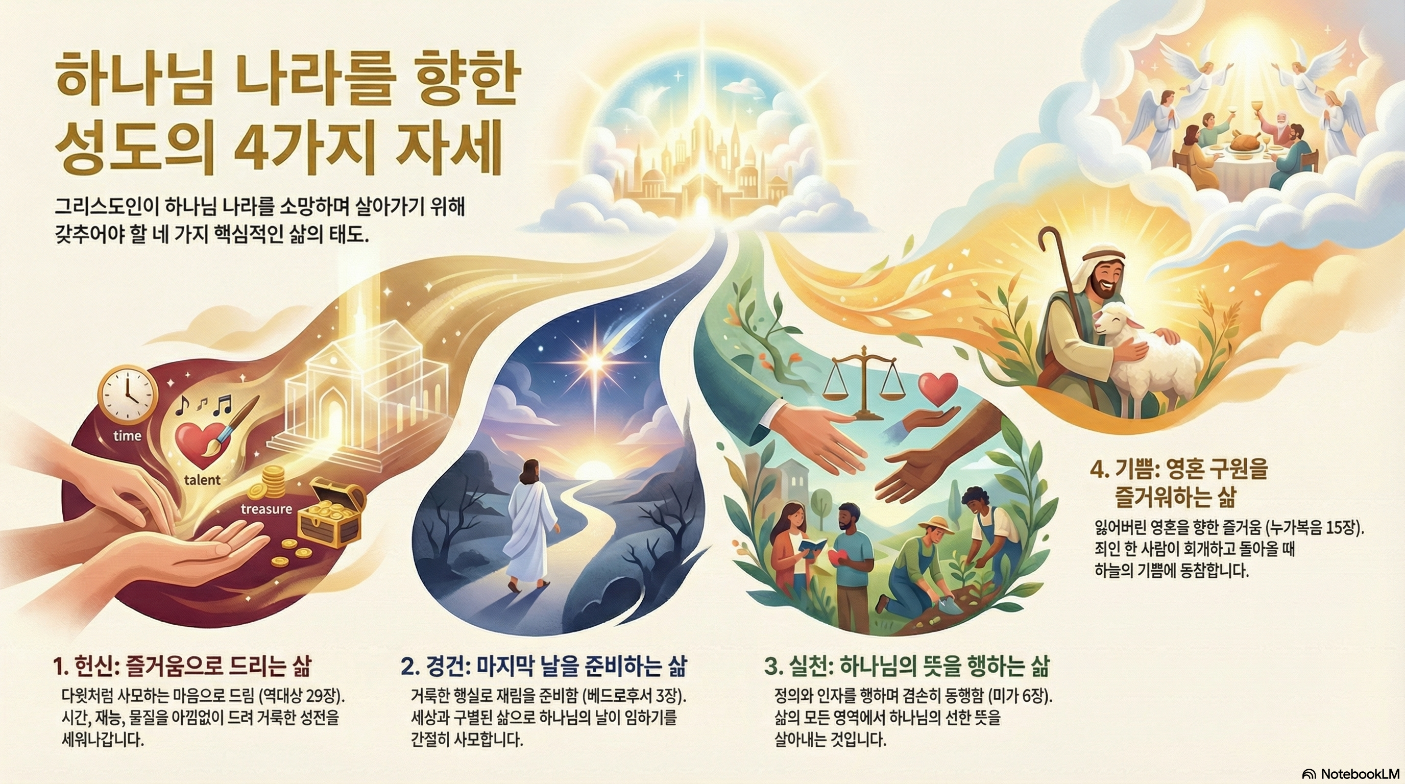 오늘 우리는 하나님 나라를 향한 성도의 태도라는 주제 아래 네 본문을 통해 우리의 삶이 어떻게 하나님을 기쁘시게 하고, 그분의 뜻을 이룰 수 있는지를 묵상했습니다.
